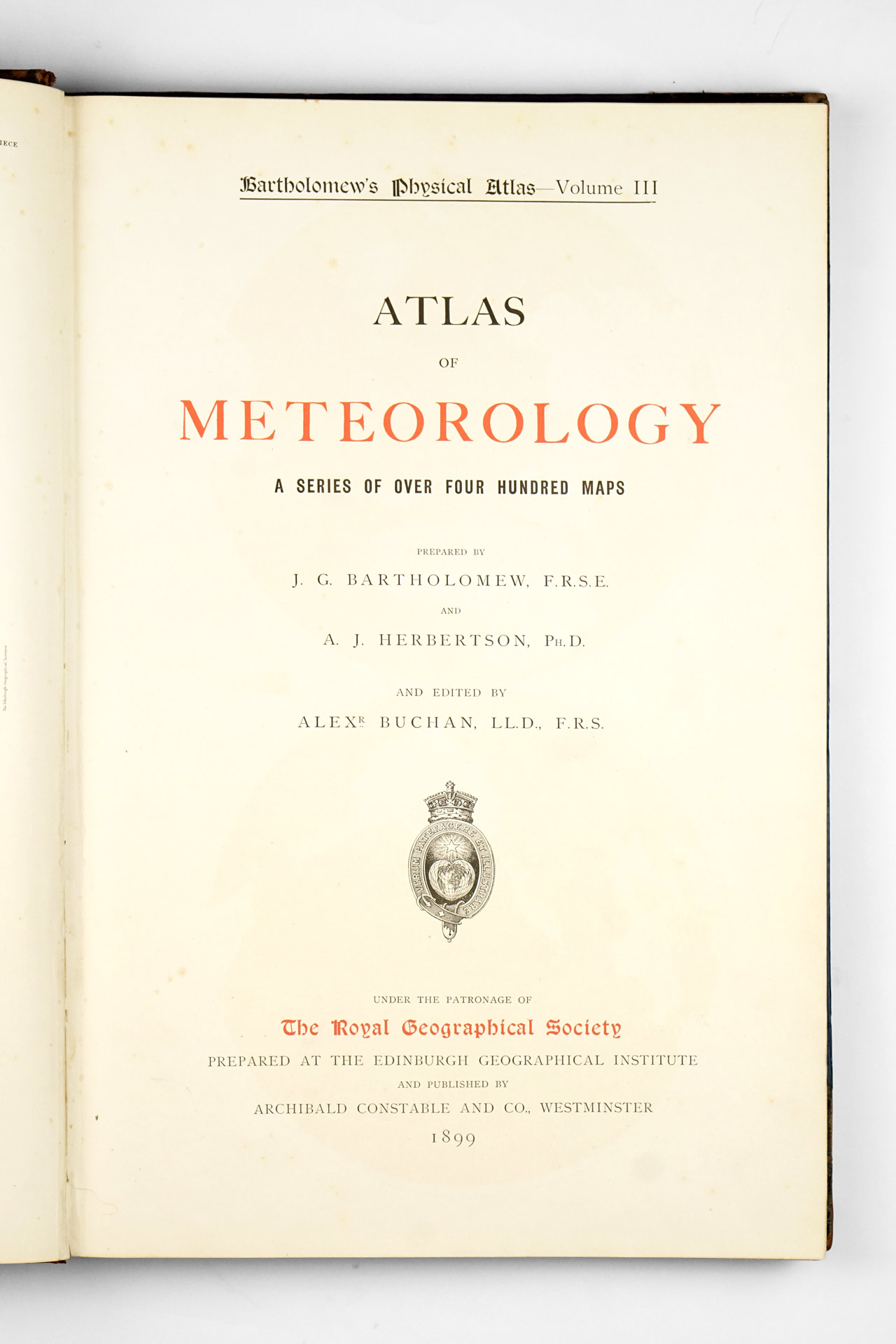 Published in 1899 by Archibald Constable and Co. under the patronage of the Royal Geographical Society, the Atlas of Meteorology stands as one of the most ambitious and influential scientific atlases of the late nineteenth century. Edited by J. G. Bartholomew and A. J. Herbertson and dedicated to Queen Victoria. The atlas forms part of the ambitious multi-volume series Bartholomew’s Physical Atlases and represents its third volume. Of the remaining volumes, the Atlas of Zoogeography (labelled as the 5th volume) is the only other title known to us to exist.