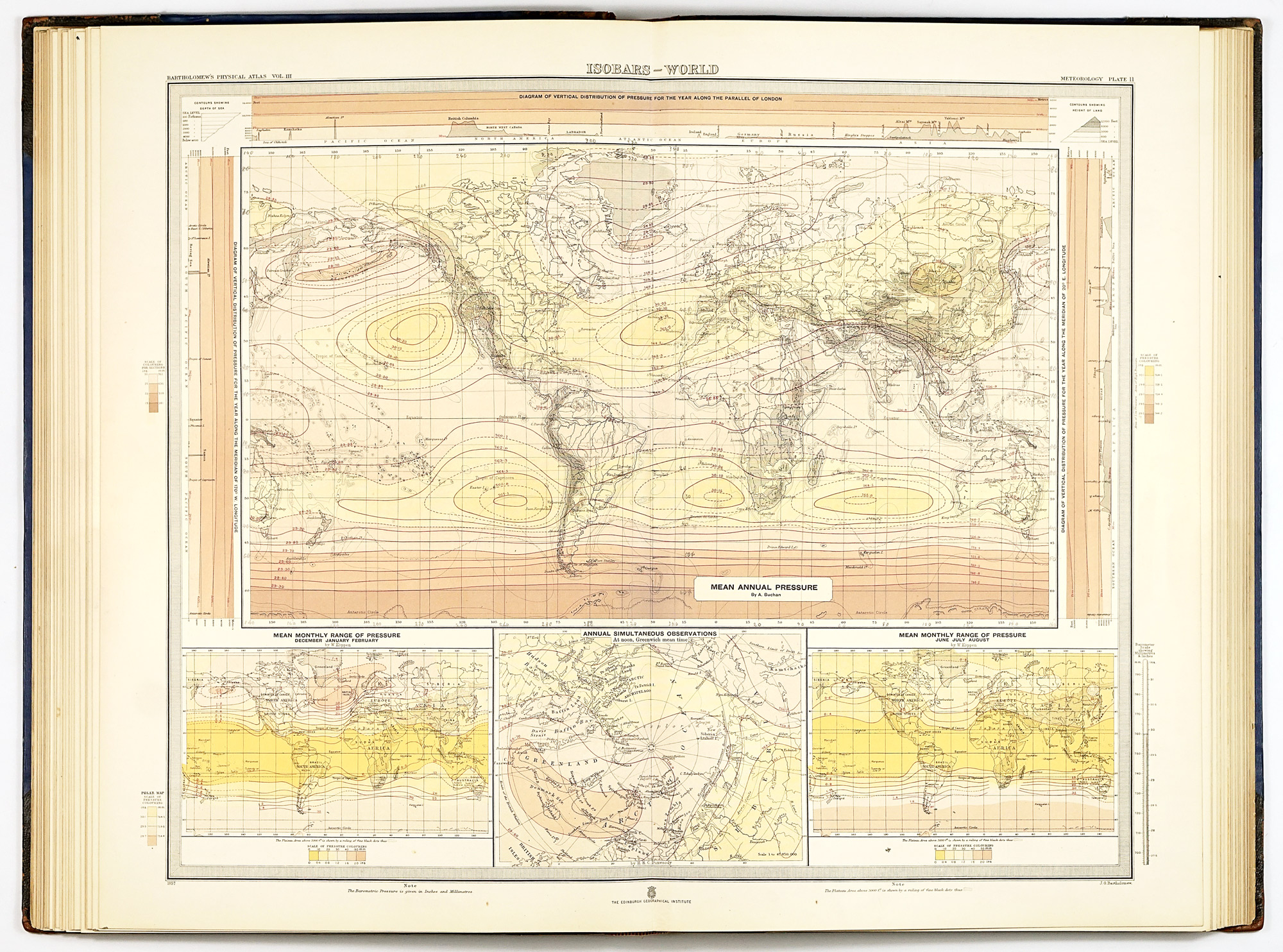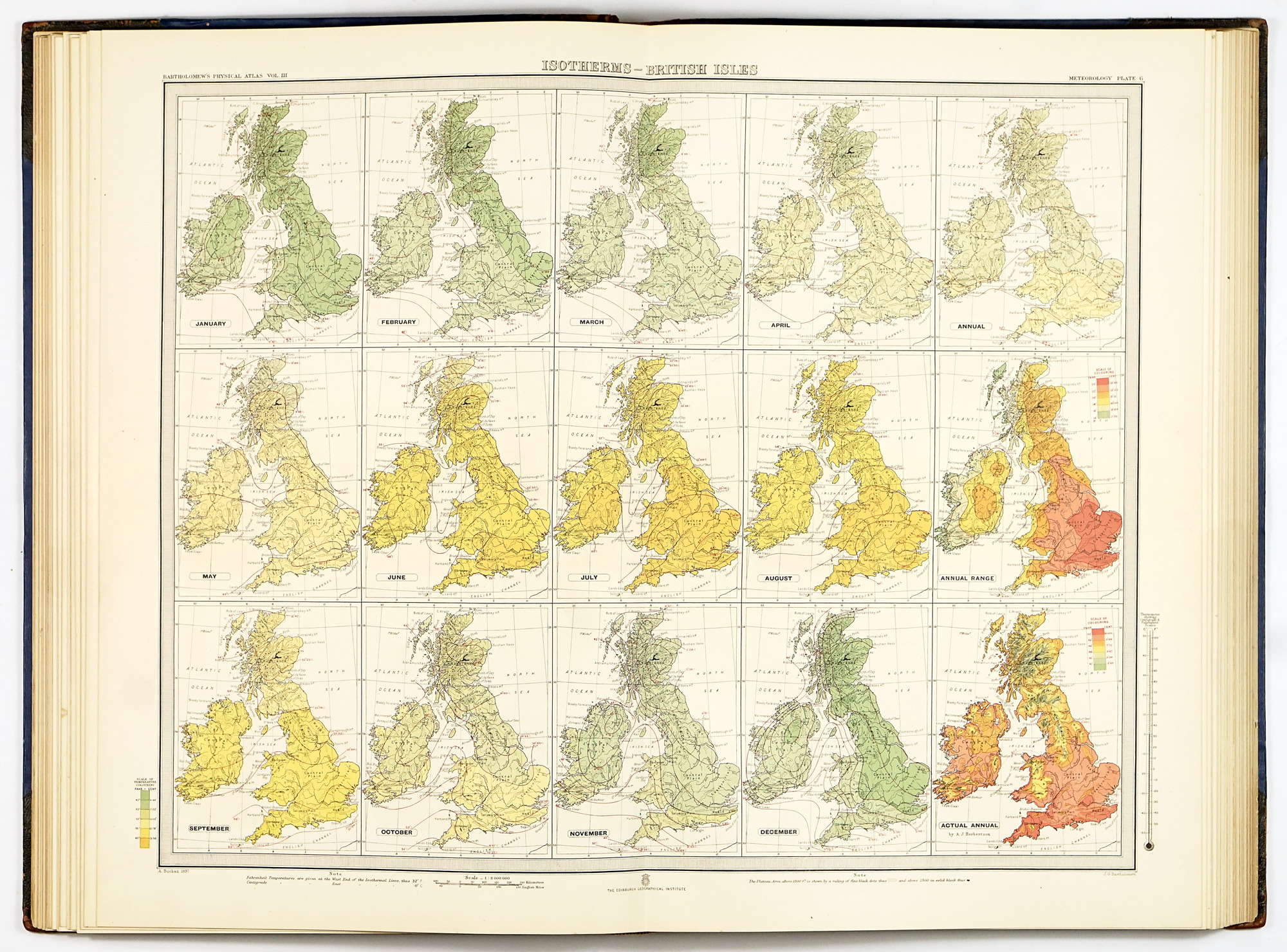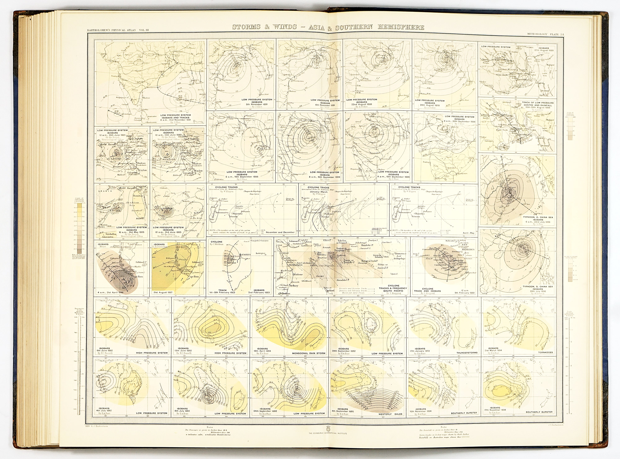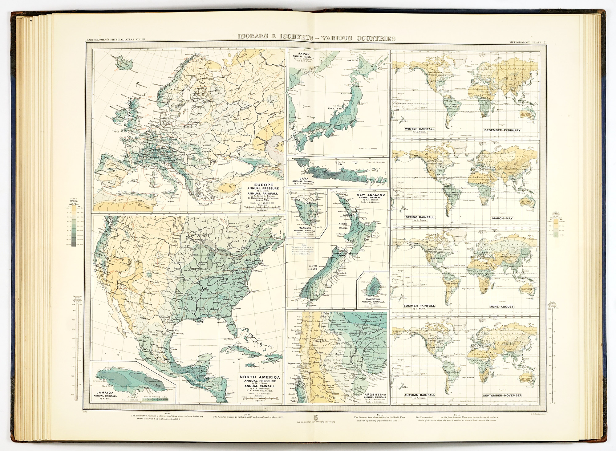 Cartographically, the atlas exemplifies the highest standards of late Victorian mapmaking. Coverage is not evenly distributed across the globe: the clearest emphasis lies on Europe, the British overseas territories—most notably India, Australia, and South Africa—as well as the United States and Canada, reflecting both the availability of observational data and the geopolitical priorities of the period. The systematic use of the metric system alongside traditional English scales reflects an awareness of international scientific practice, while the disciplined application of uniform color gradations for different meteorological phenomena ensures clarity and comparability across hundreds of plates. This visual consistency, difficult to maintain at such scale, is one of the atlas’s greatest strengths and a hallmark of Bartholomew’s school.