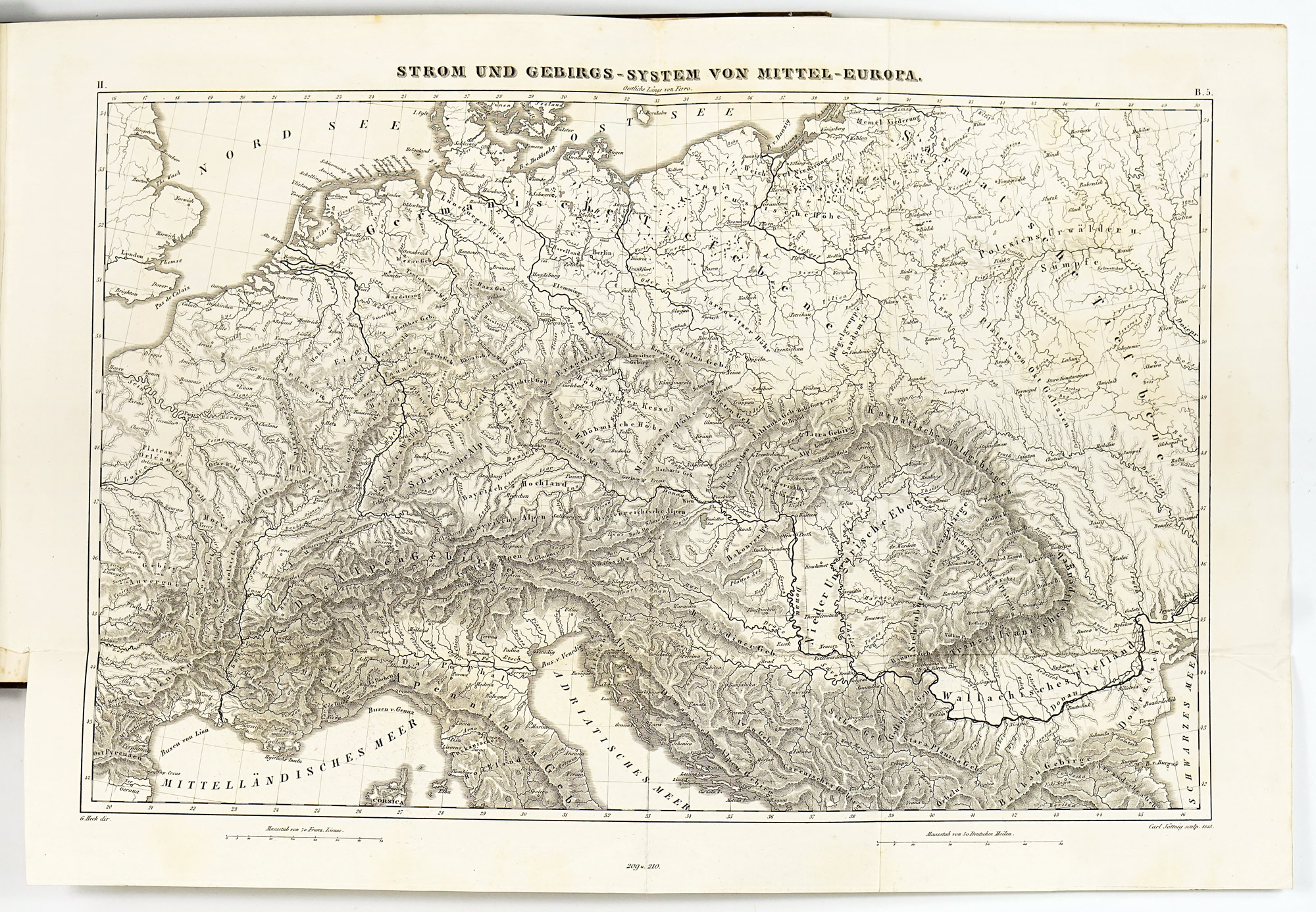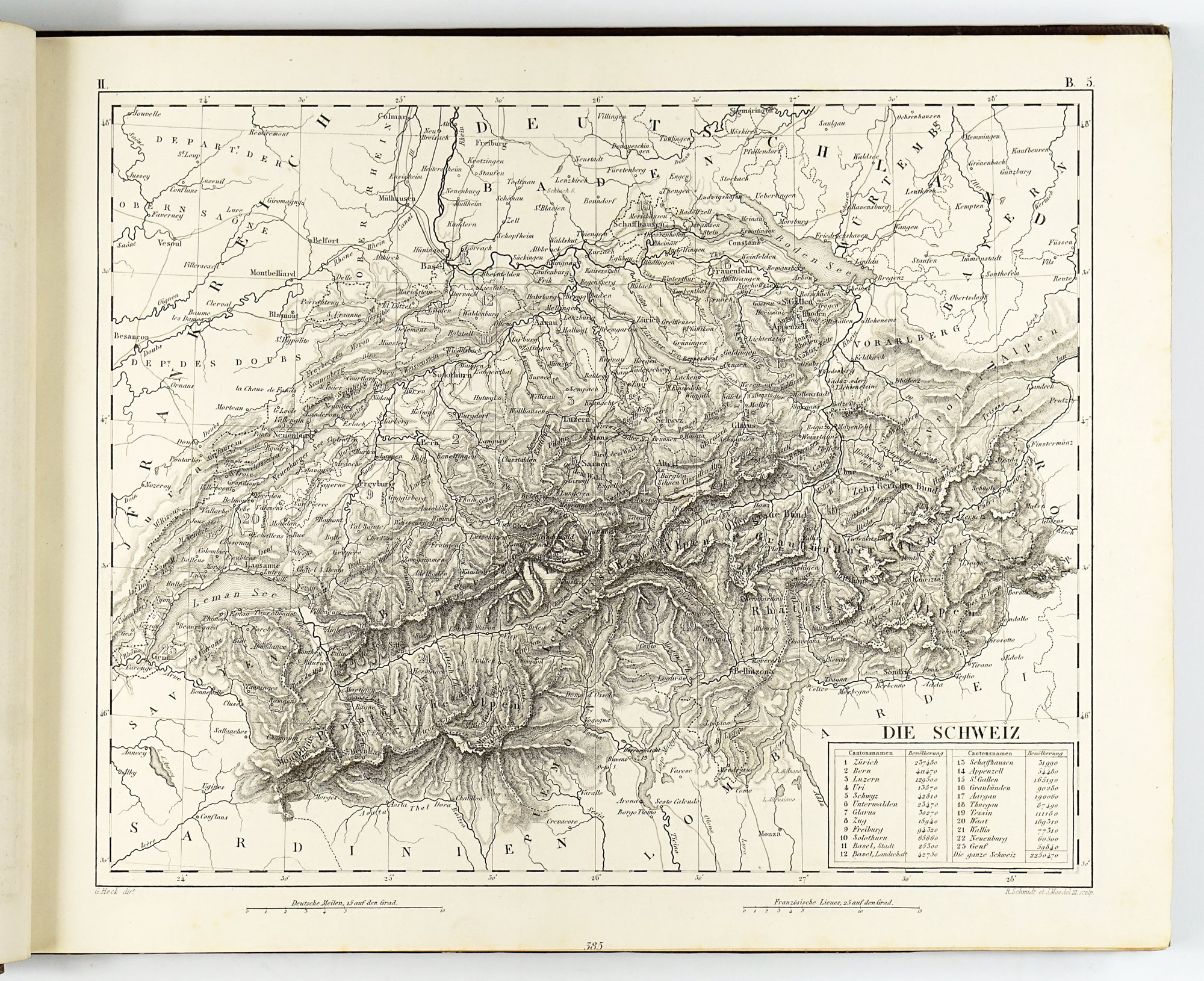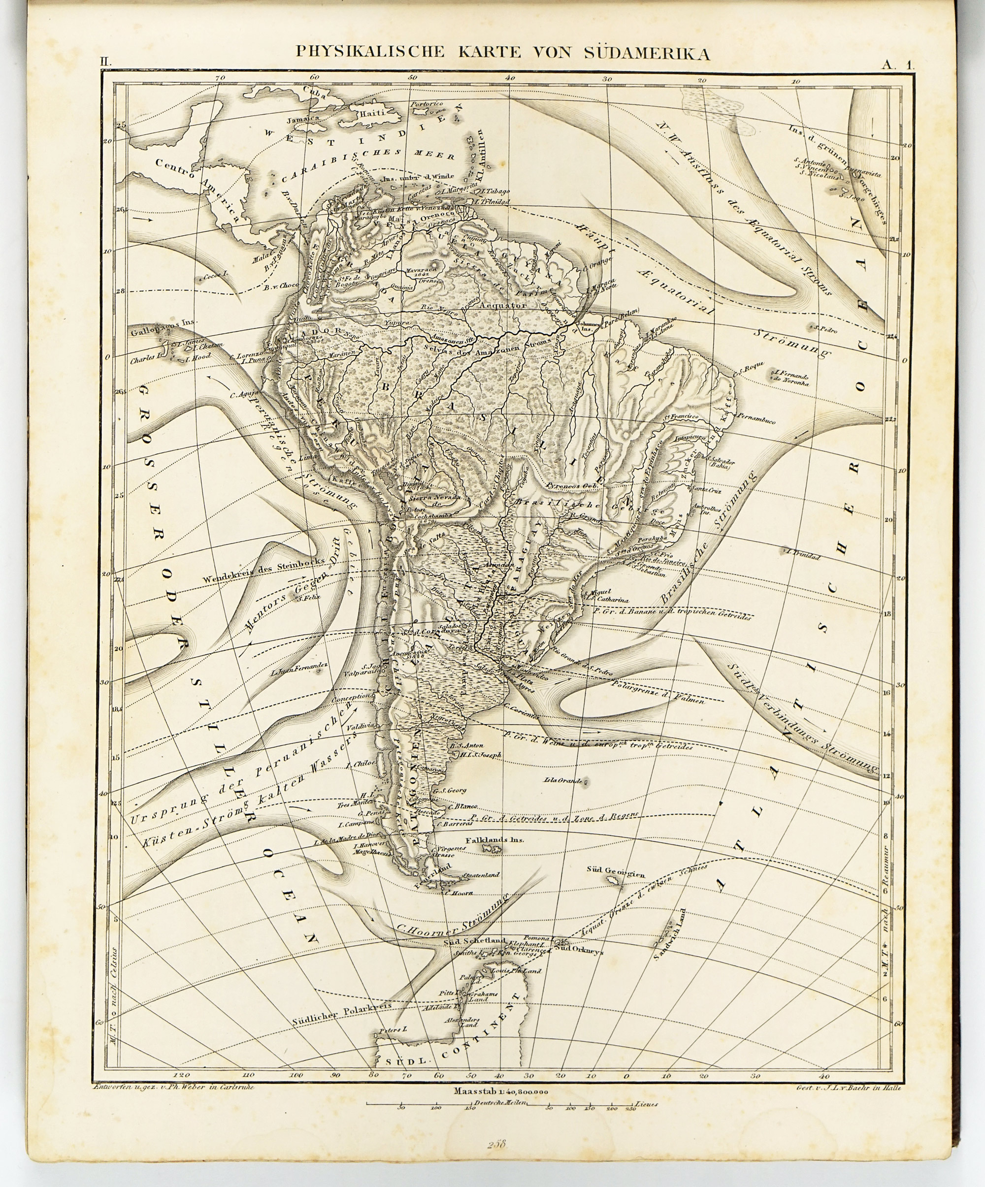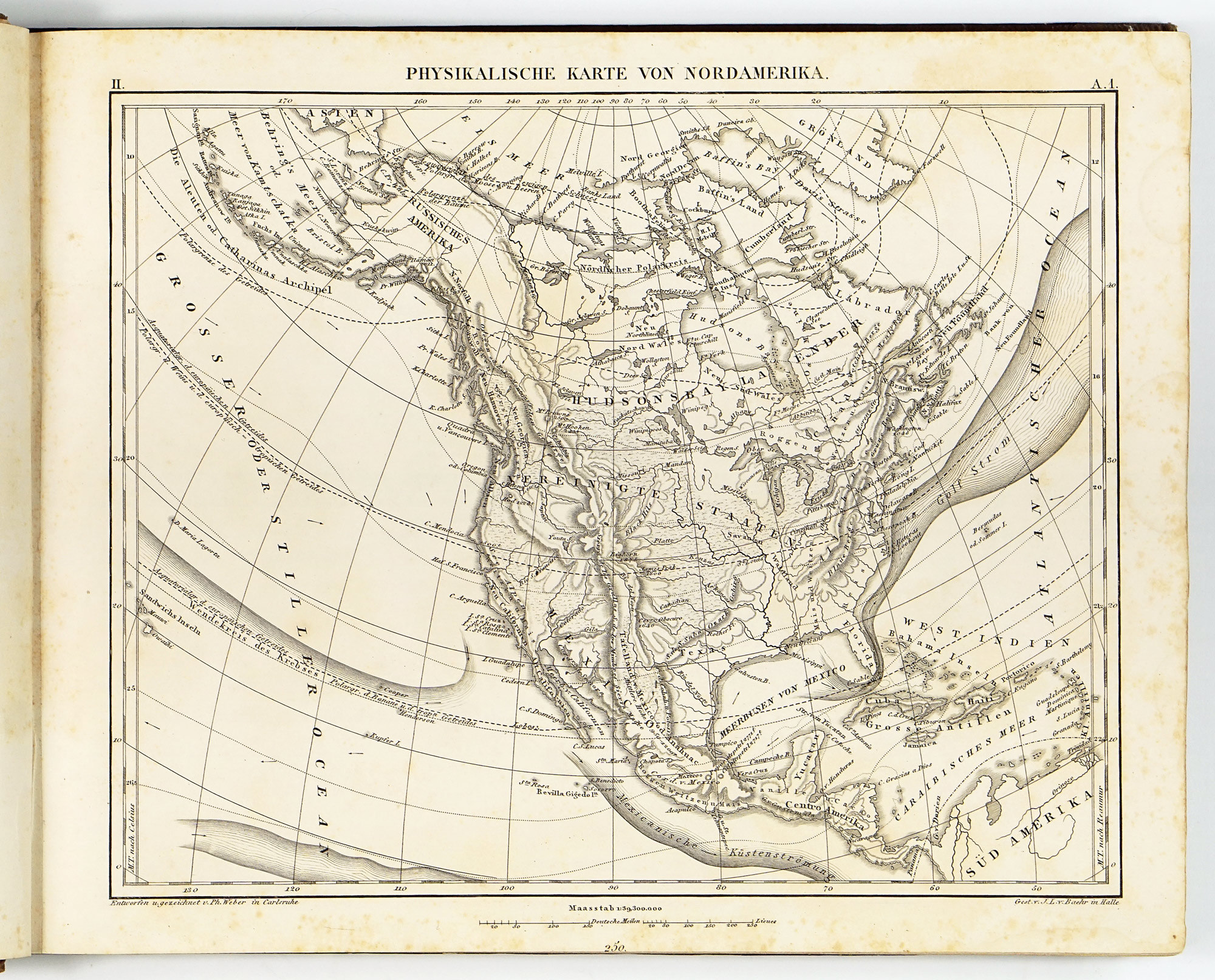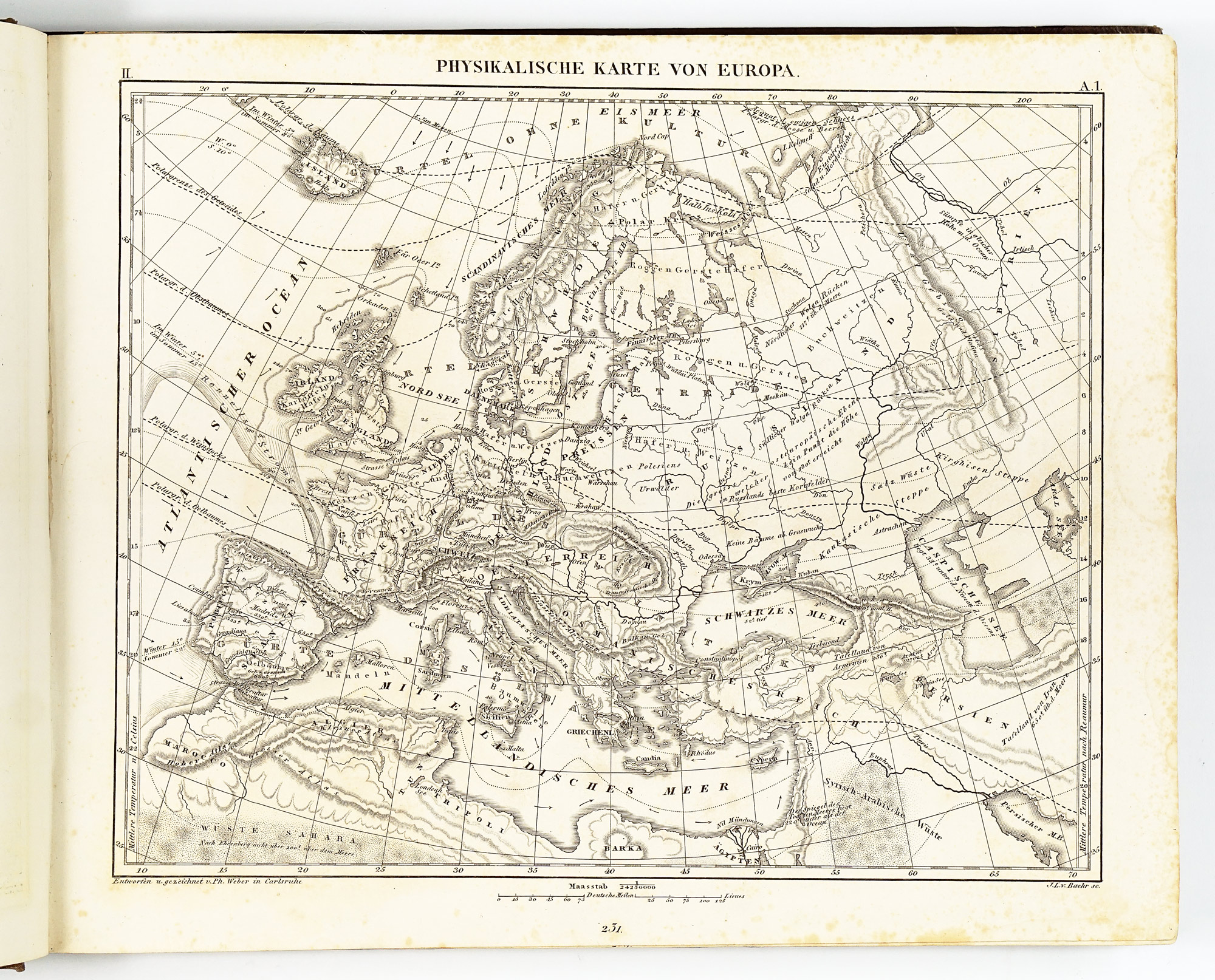 The geographical section is the most traditionally “atlas-like” part of the Bilder-Atlas. Although the maps were issued uncoloured, they are finely engraved, richly detailed, and remarkably easy to read. At first glance, the physical maps may appear somewhat dull compared to traditional atlases, however when closely inspected, a wide range of carefully encoded information is revealed, including, ocean currents, continental shelves with depth soundings, the distribution and boundaries of major organic products and animal species, ethnic groups as well as isotherms indicating mean annual temperatures.