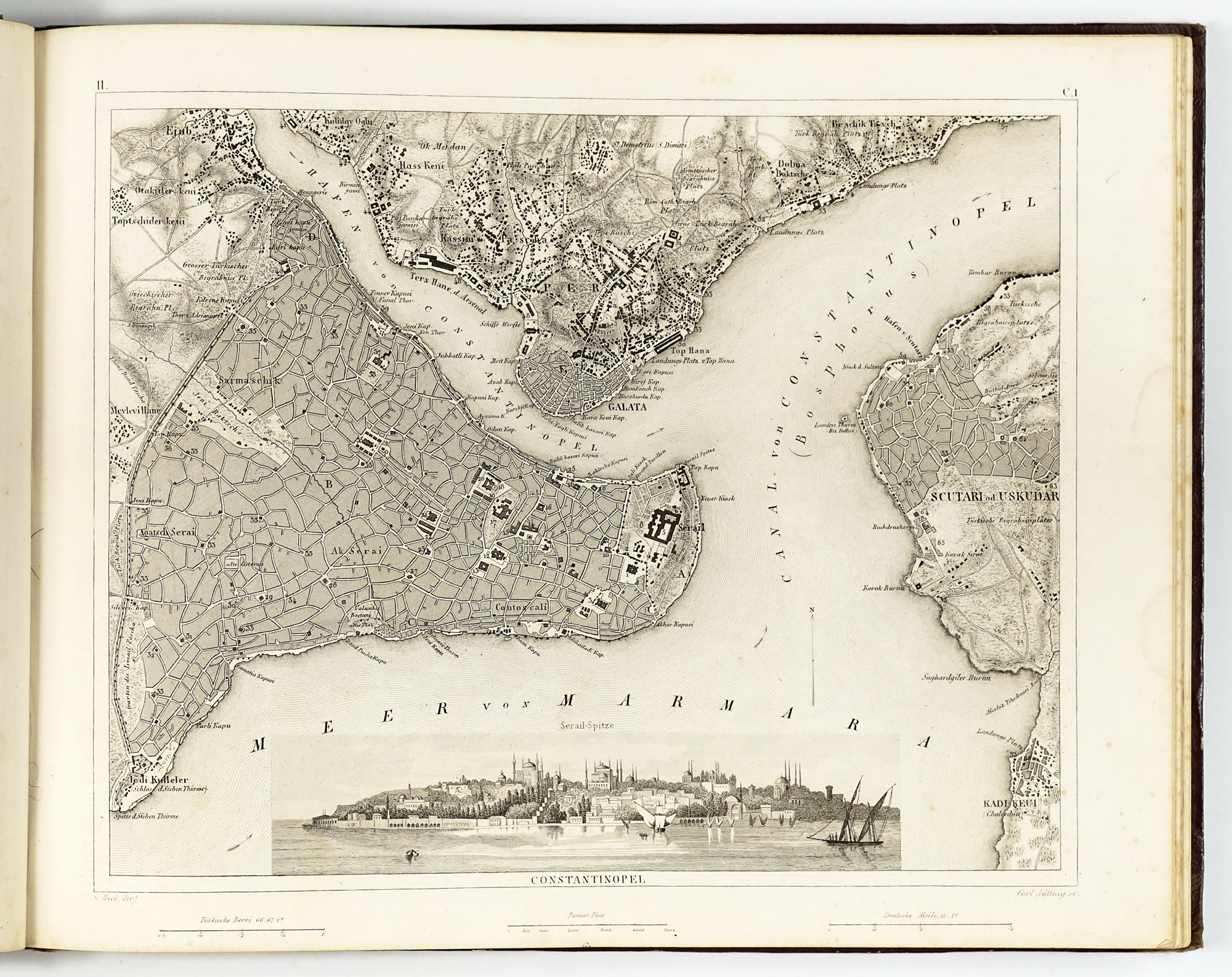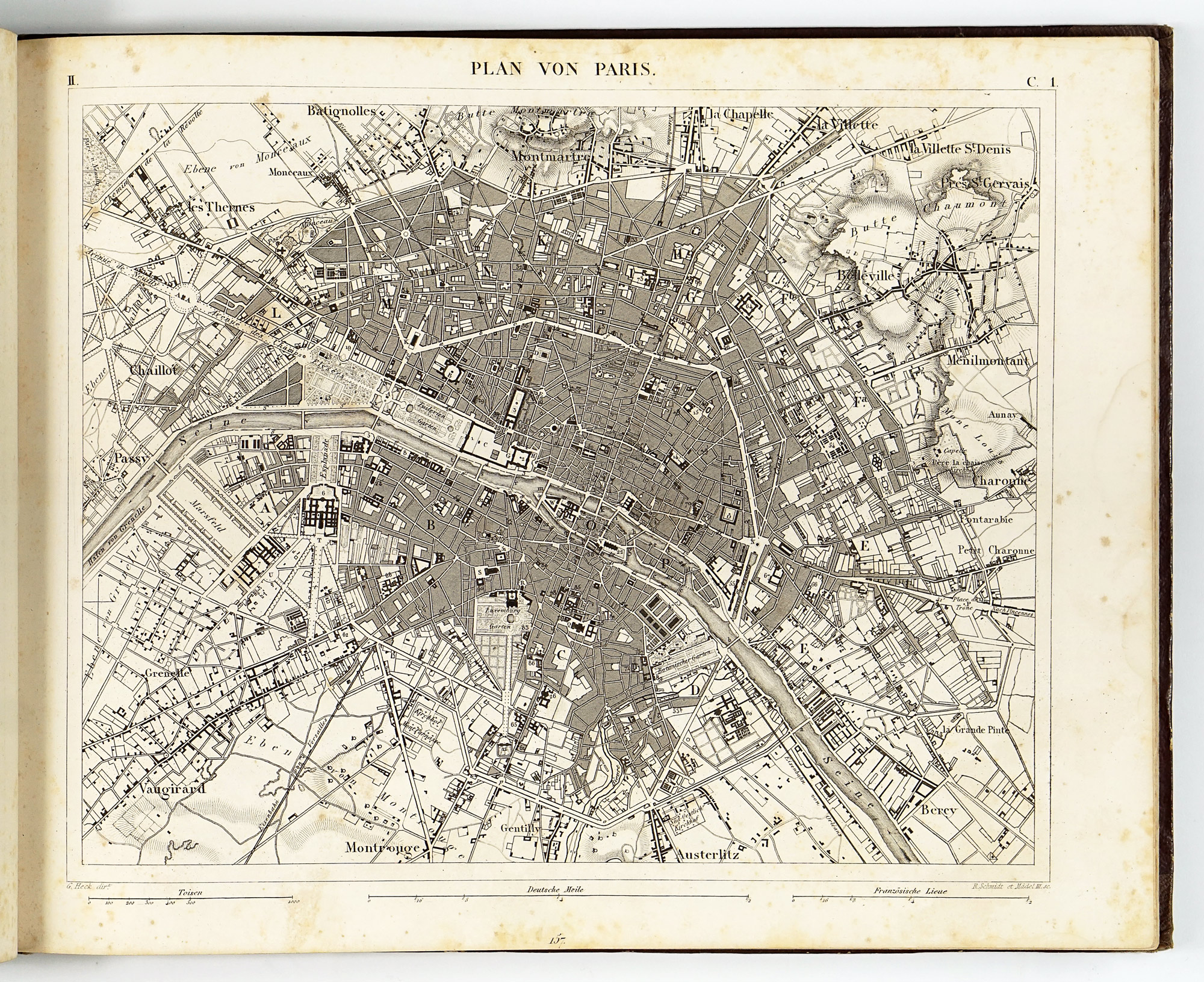 Particularly notable is the large number of urban plans included, depicting 21 cities—among them London, Paris, Istanbul, St. Petersburg, Vienna, Rome, Milan, Madrid, Lisbon, Amsterdam, Copenhagen, Stockholm and several others—spread across 12 plates. In these plans, major buildings are highlighted, marked by a number and explained in the accompanying encyclopedia text, giving the Bilder-Atlas clear and practical advantage over more conventional atlases of the period.