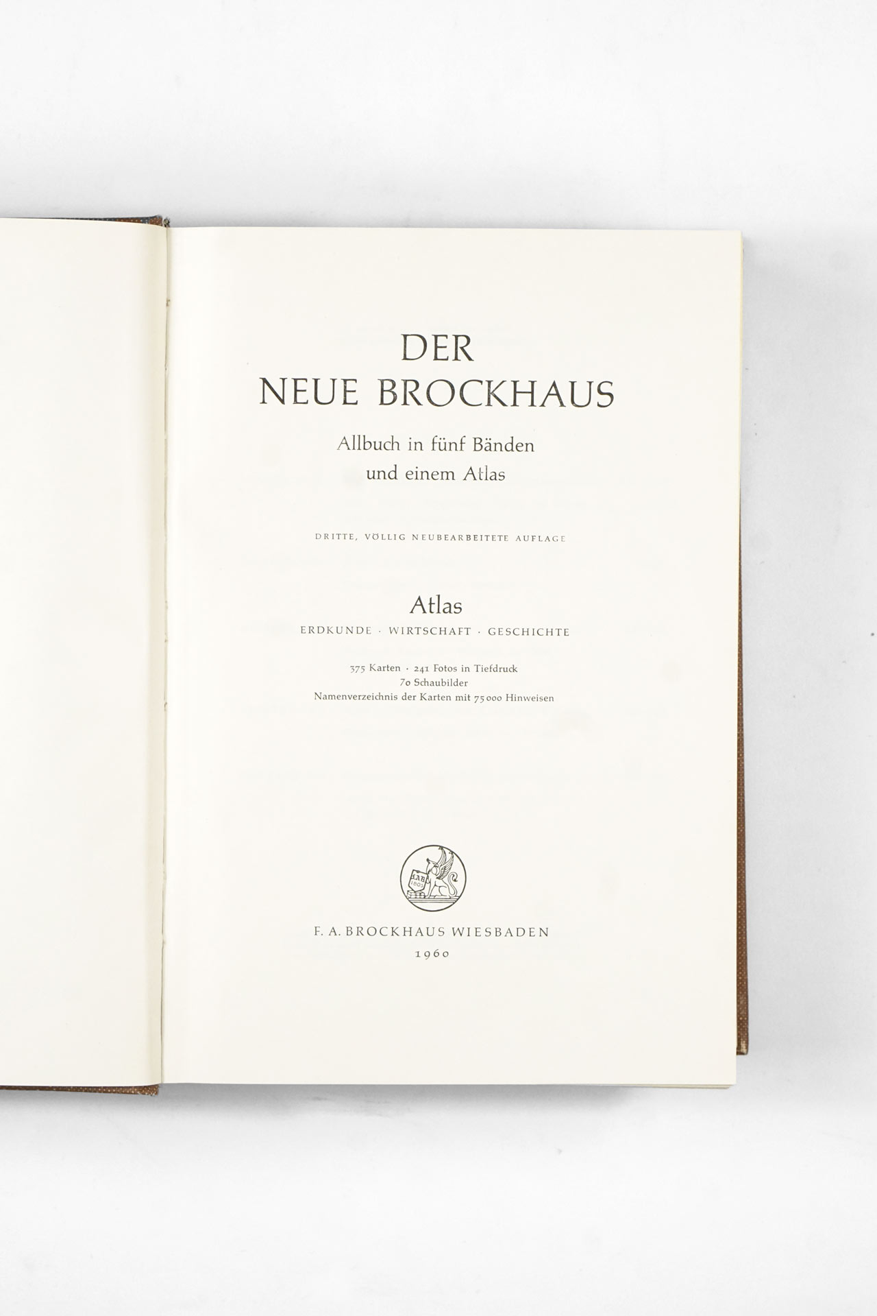 The Atlas volume of Der Neue Brockhaus, published in 1960 by F. A. Brockhaus, Wiesbaden, represents one of the finest examples of mid-20th-century German cartographic and encyclopedic publishing. Issued as part of the Der Neue Brockhaus (third, completely revised edition), this atlas was conceived not merely as a collection of maps, but as an integrated visual companion to a modern general encyclopedia.