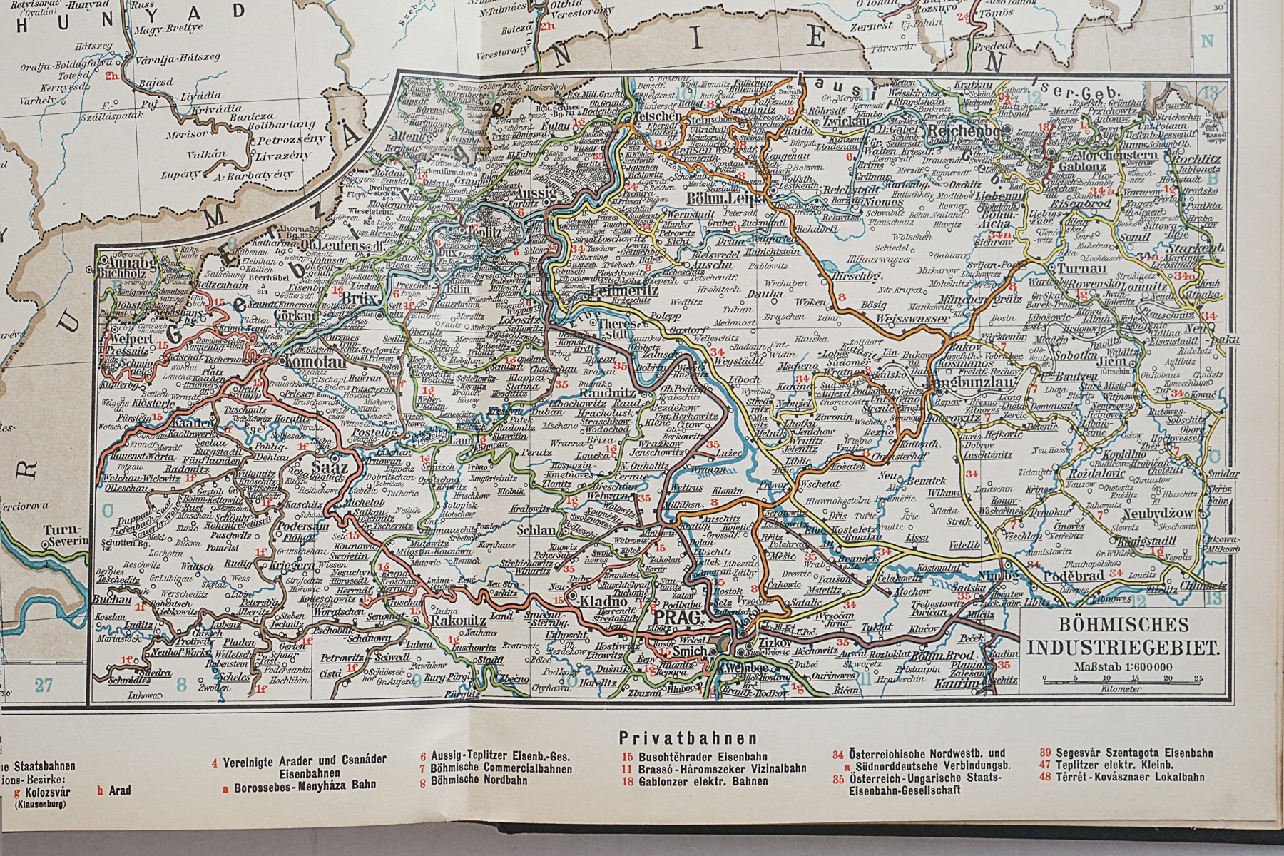 The maps of German, Austria-Hungary and Switzerland were printed using up to 8 colours, other maps mostly only 4 colours. The whole UK is shown in just one double page overview map, confirming that the main focus of this atlas is continental Europe.