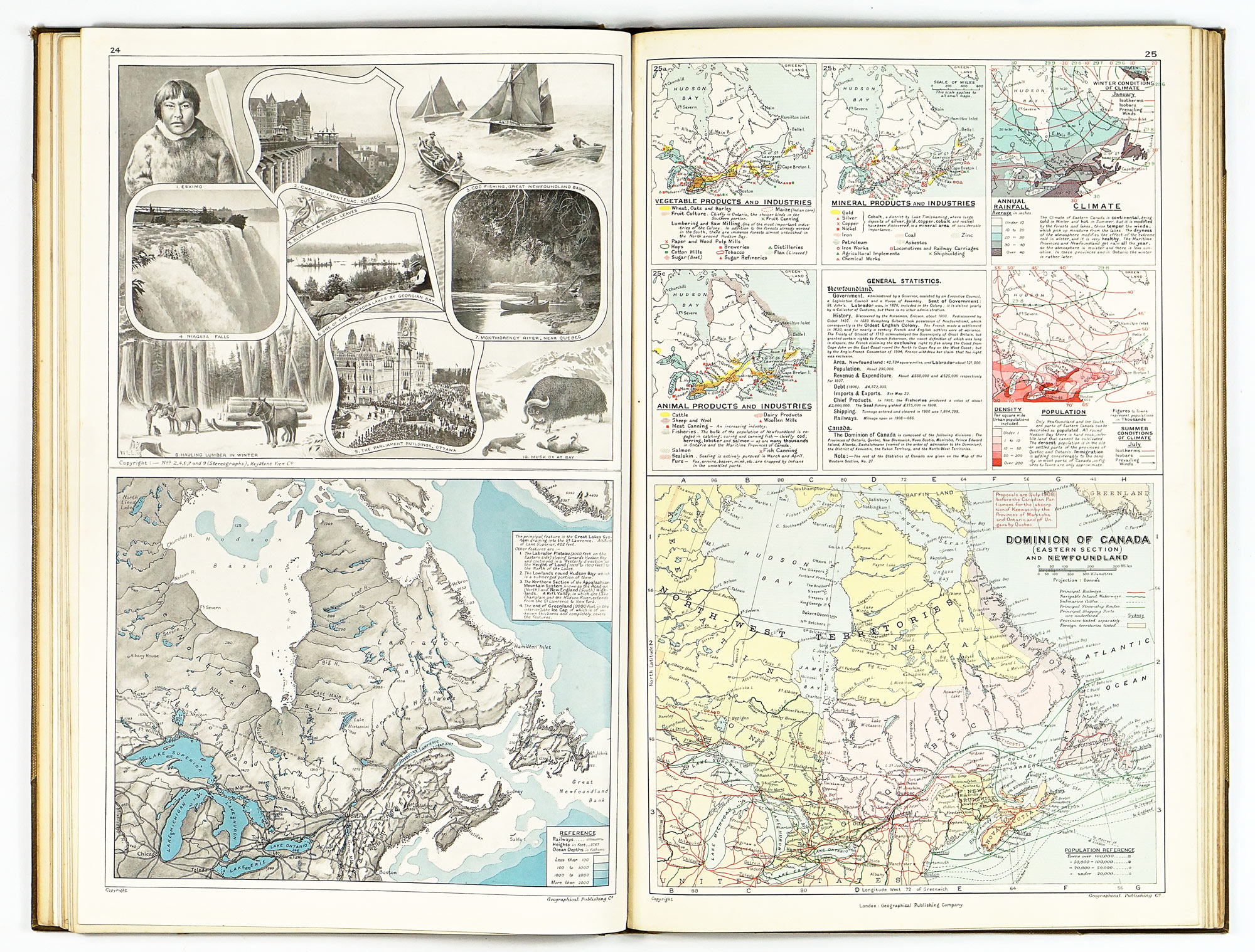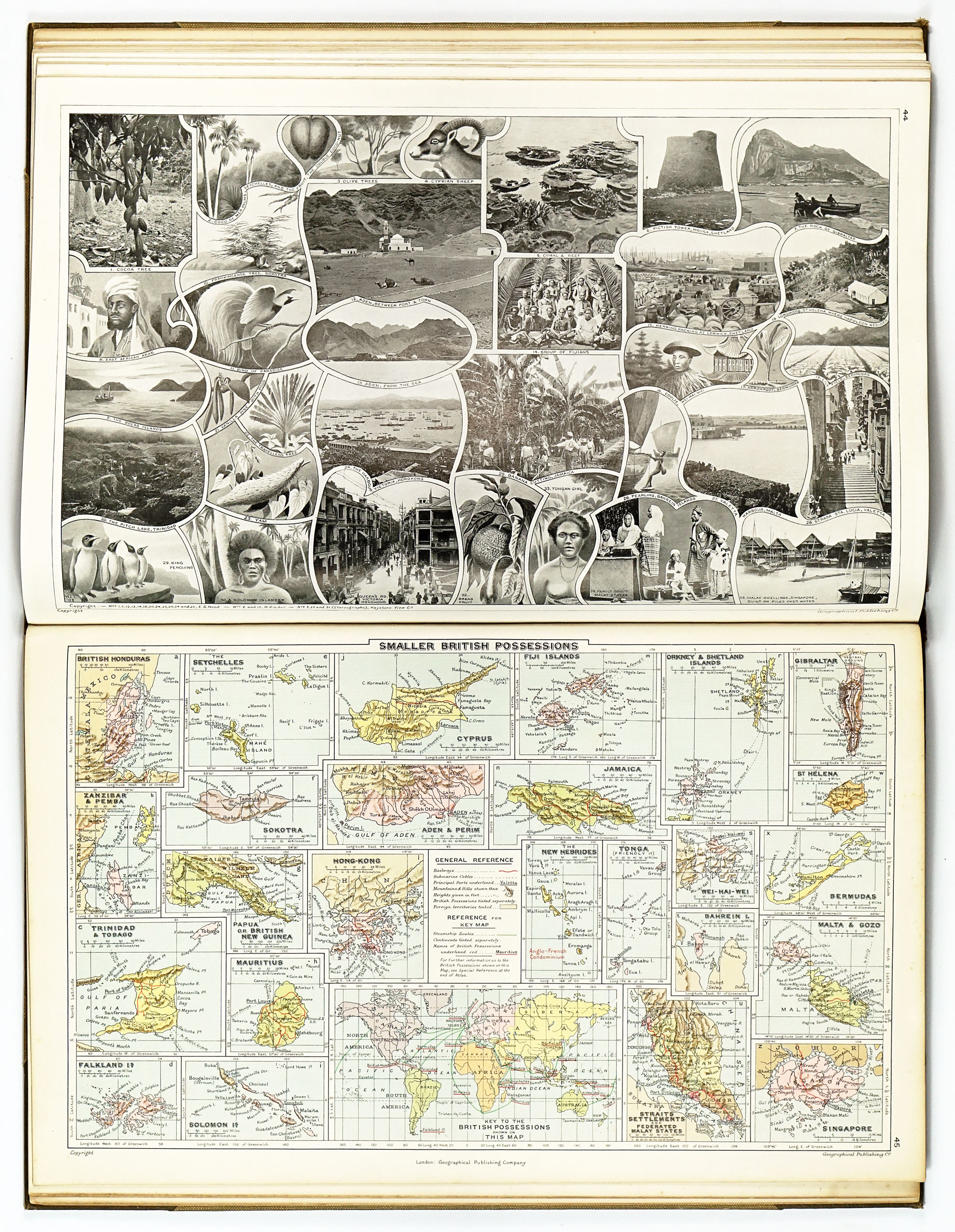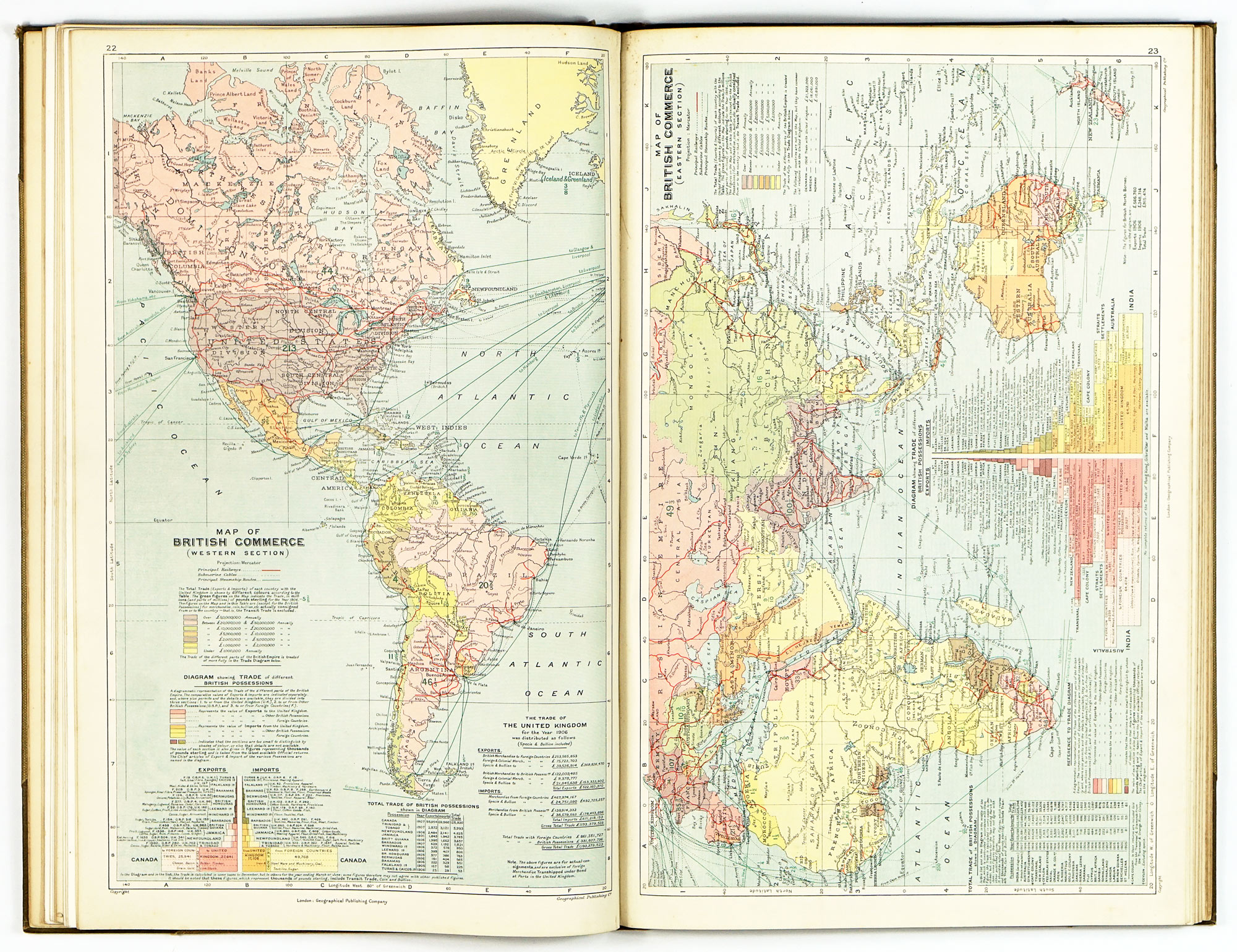 In addition to maps, the atlas is rich in statistical data: areas and populations of colonies, protectorates, and spheres of influence; general statistics for smaller and less frequently mapped British possessions; and lists of principal commercial products.