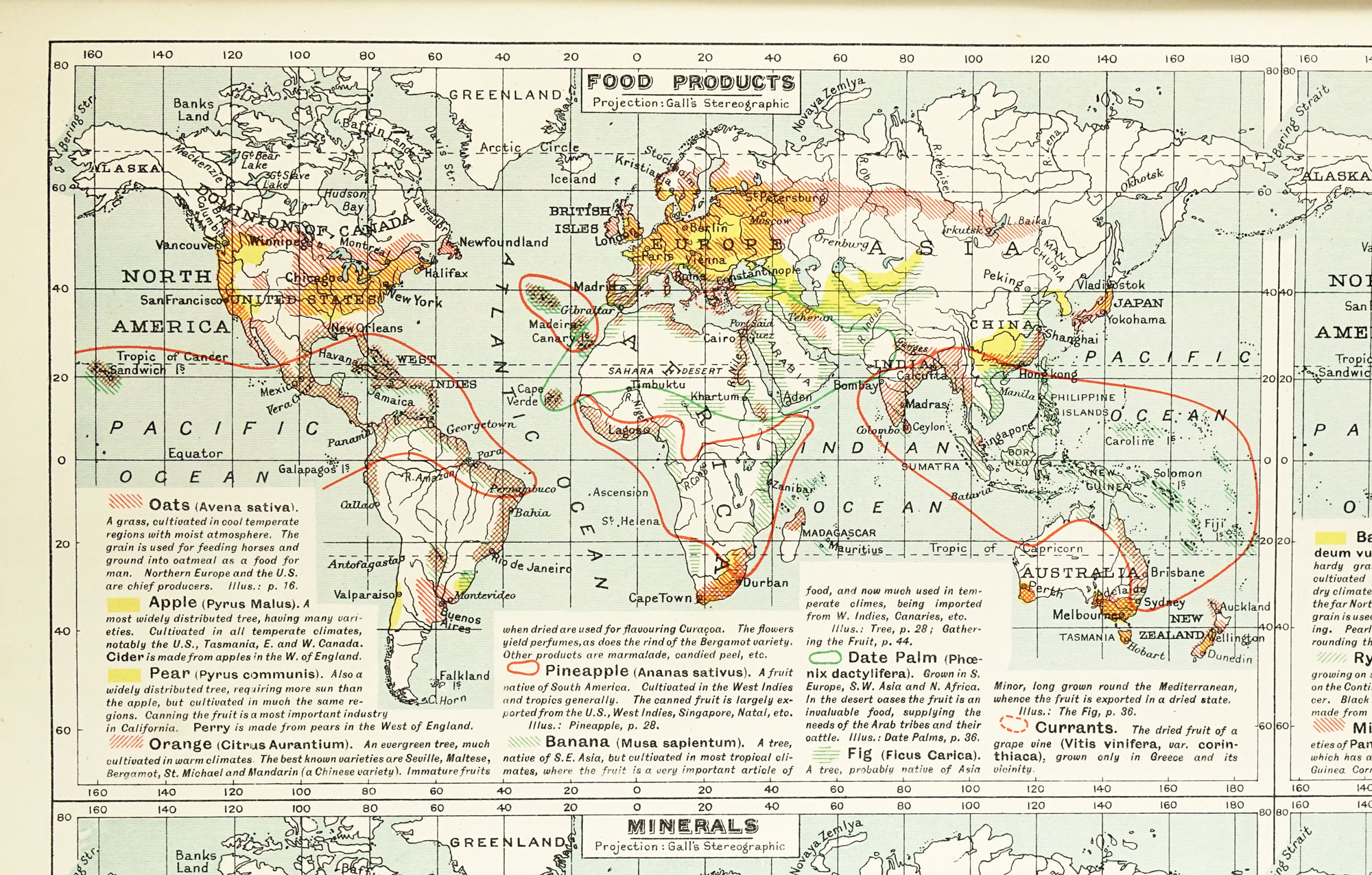 True to its imperial purpose, the atlas places exceptional emphasis on commerce and production. A dedicated series of twelve maps illustrates the global distribution of over seventy economic products, including foods, raw materials, and minerals, each identified and described directly on the maps. Additional products are catalogued in detailed lists at the end of the volume. In this regard, the atlas is similar to the Atlas of the World's Commerce, published in 1900 by J. G. Bartholomew.
