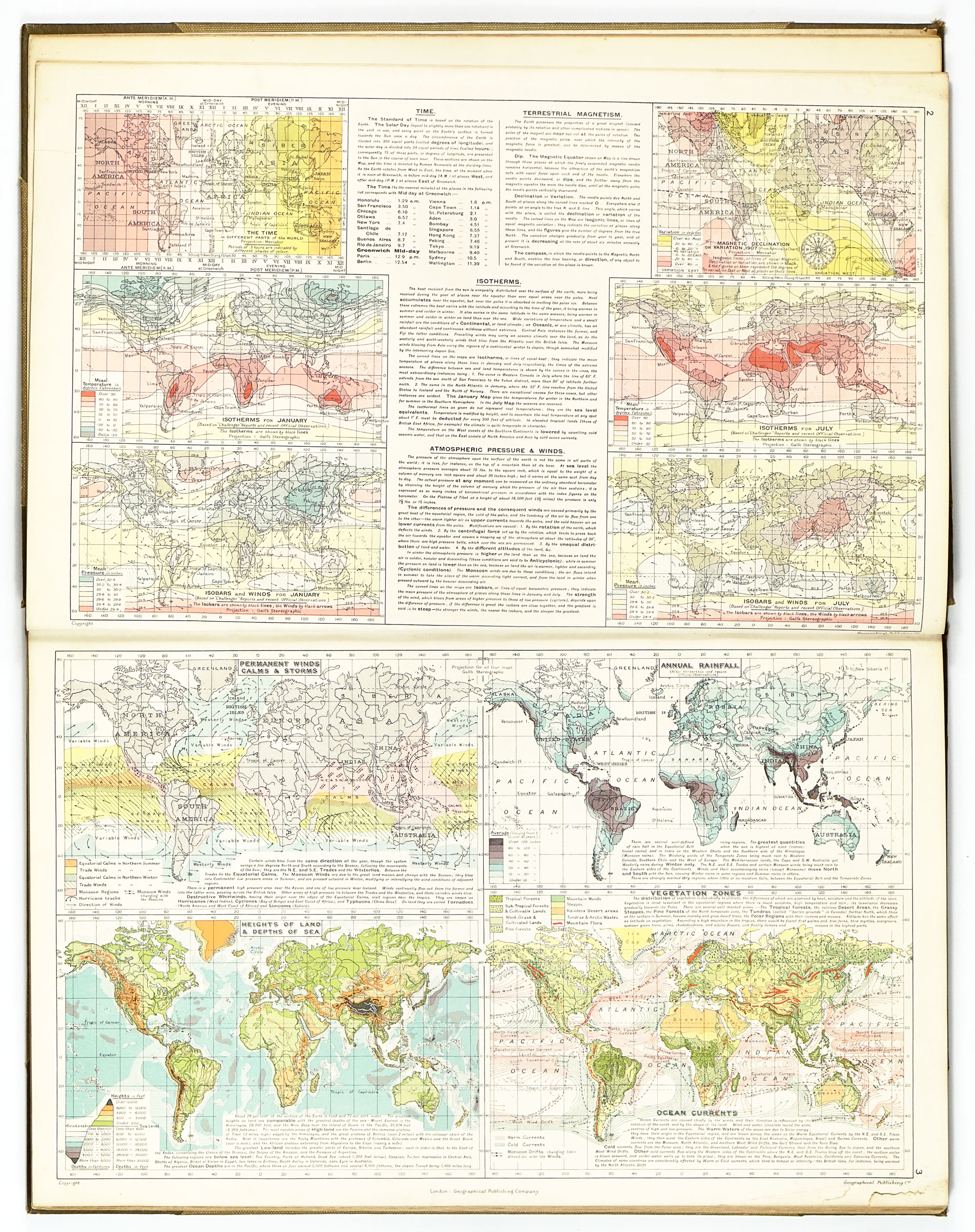 Beyond imperial territories, the atlas devotes considerable space to global physical conditions. Sixteen world maps address subjects such as atmospheric pressure, winds, rainfall, ocean currents, magnetism, tides, volcanoes, earthquakes, and vegetation zones. Each is accompanied by concise explanatory text, intended to make the atlas largely self-sufficient without constant reference to other works.